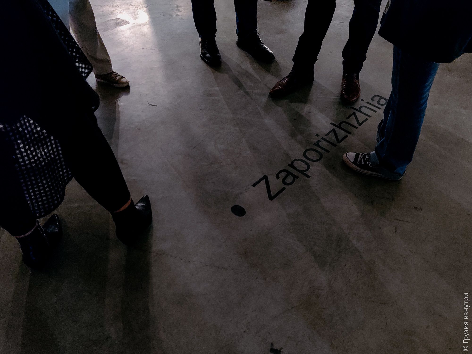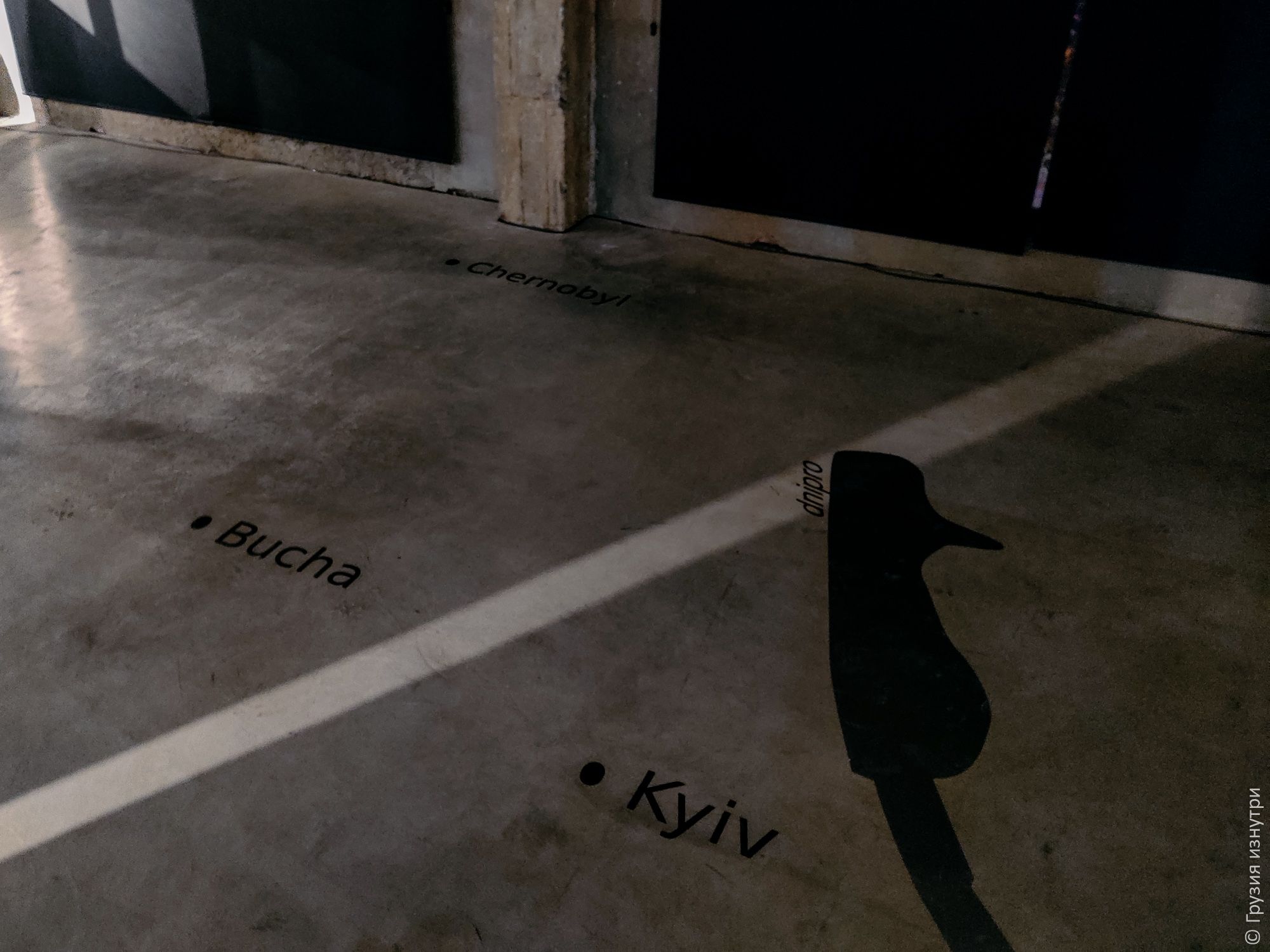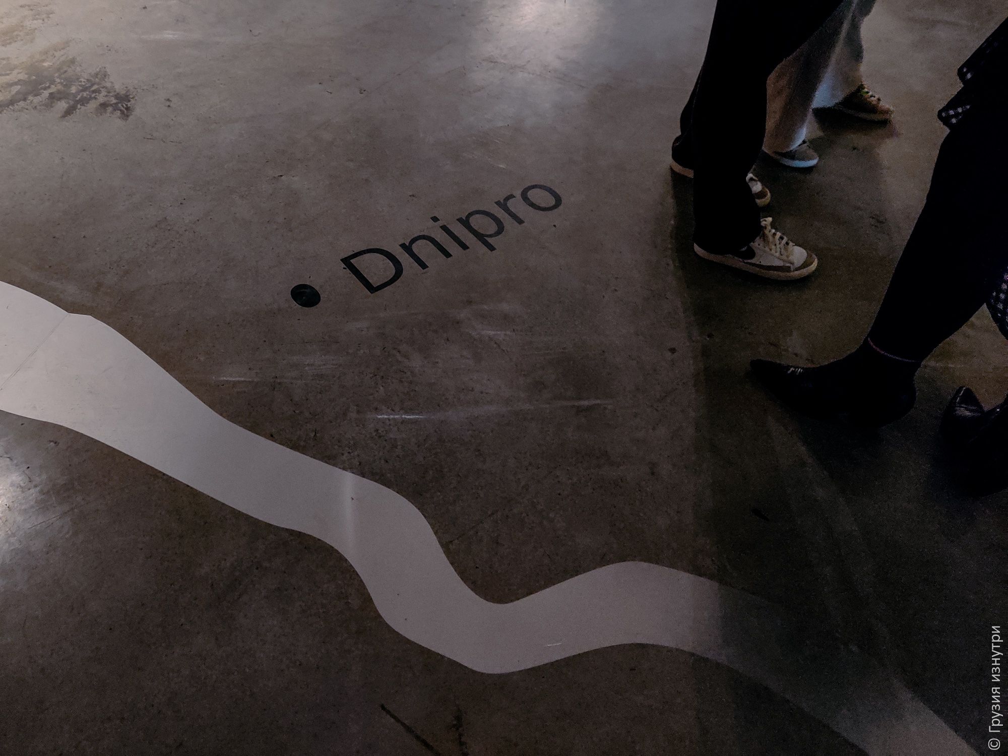 The entire floor of the exhibition space is designed as a map of Ukraine, with city names and the Dnipro River marked on it.