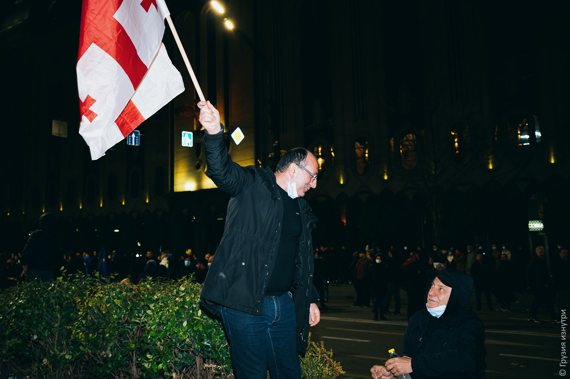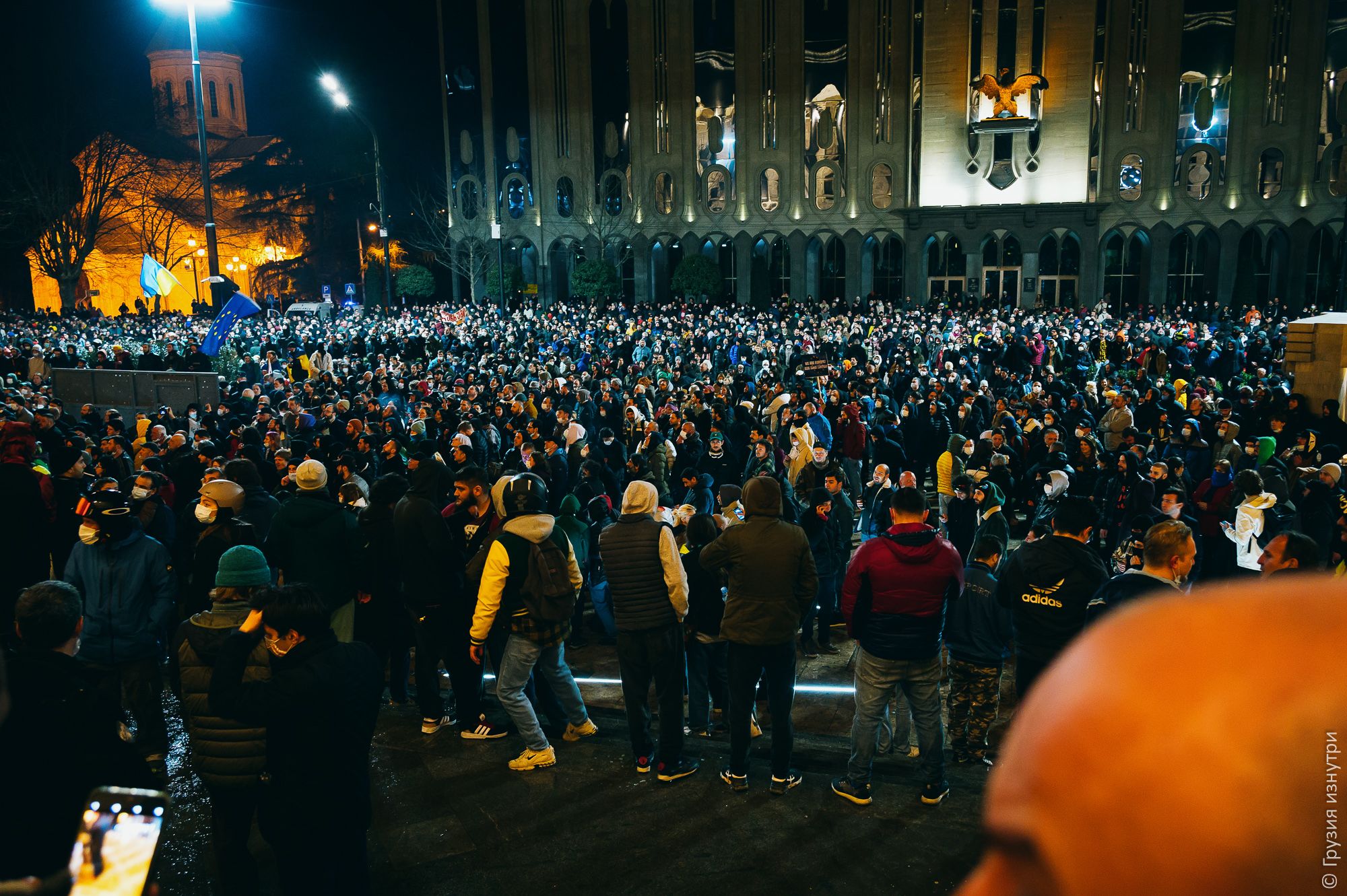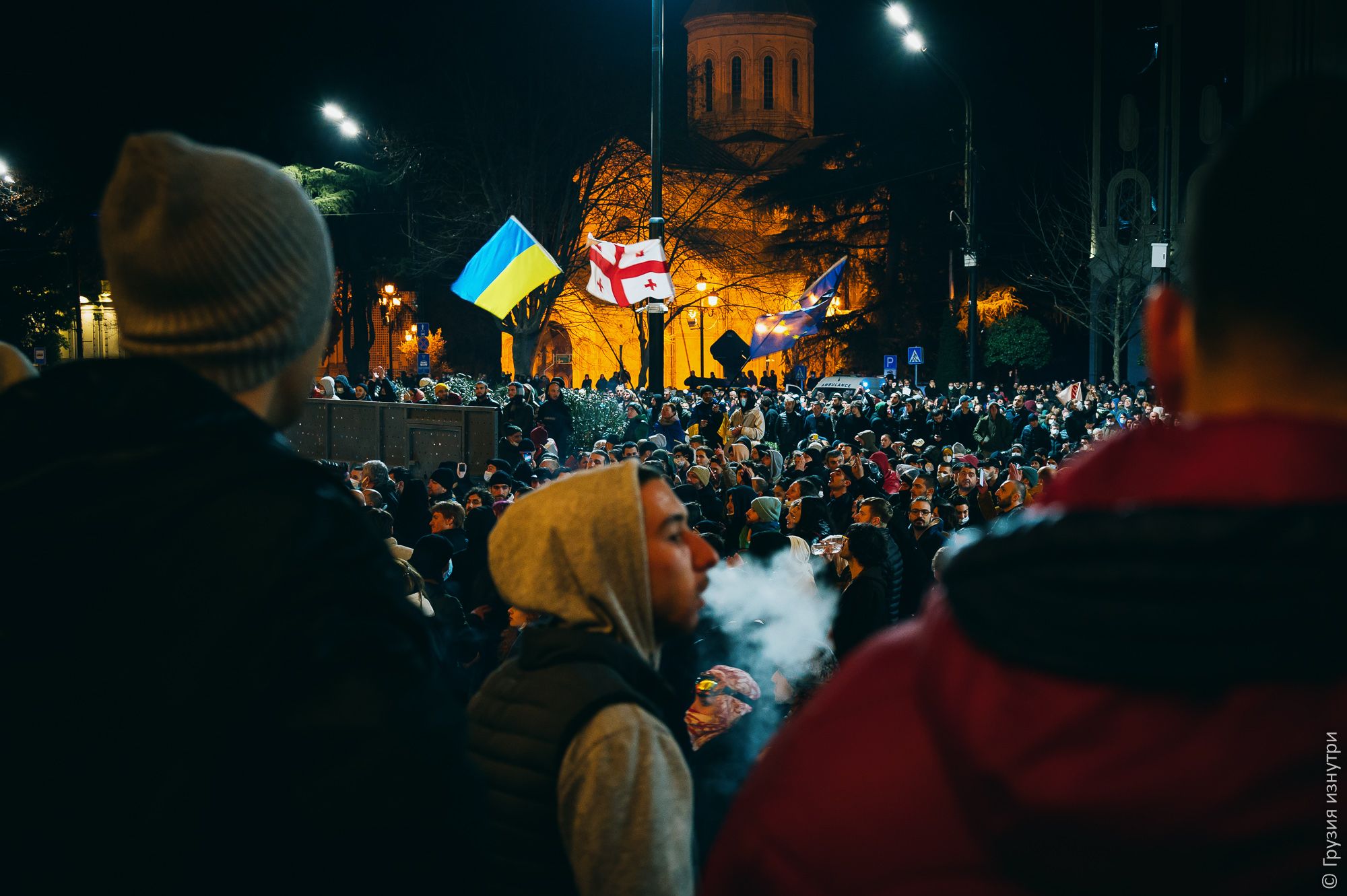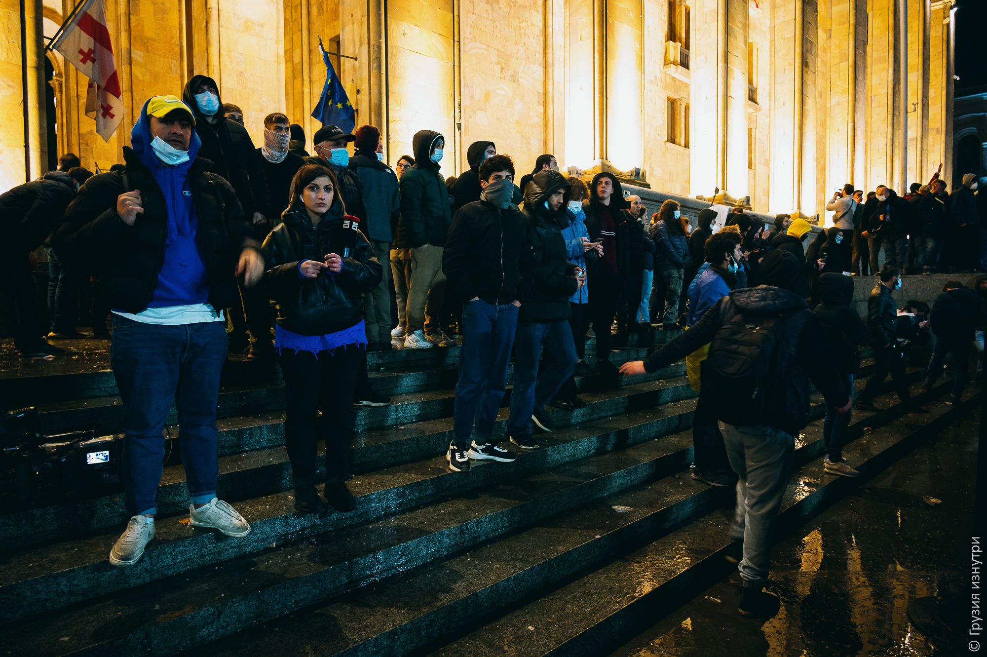 People were standing with flags — mostly Georgian and EU flags.