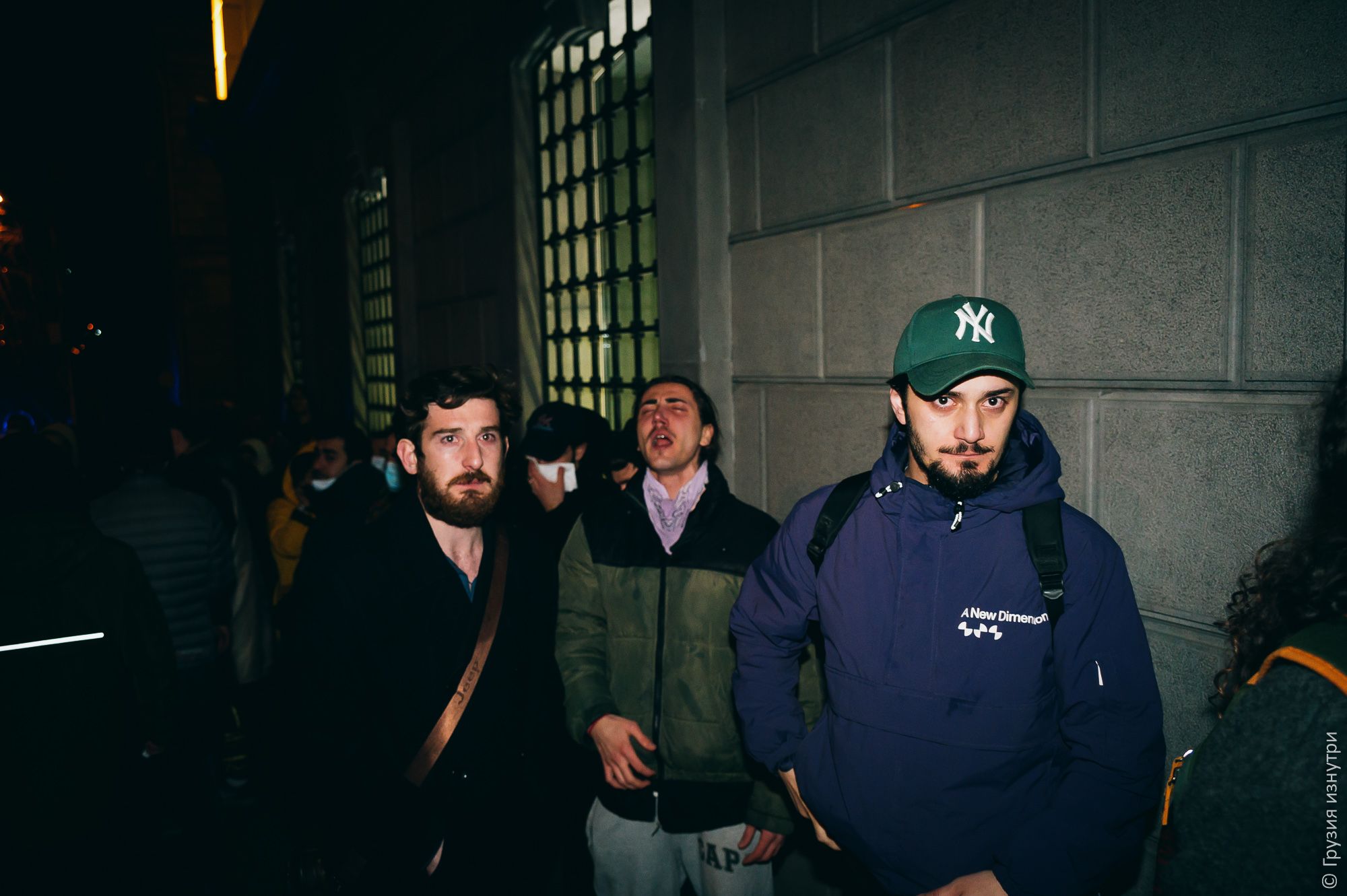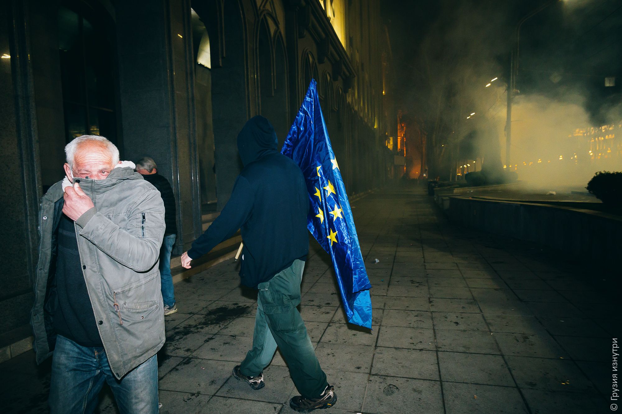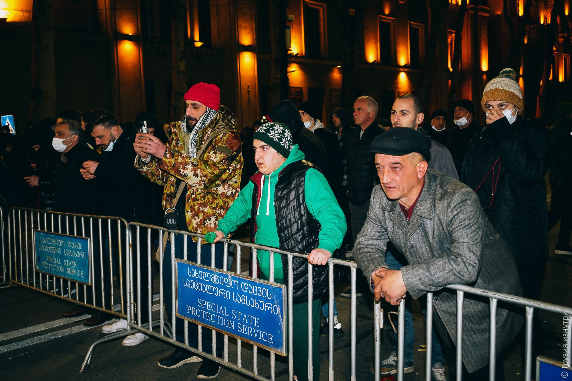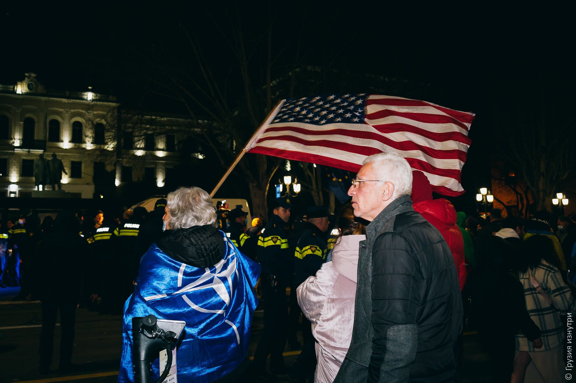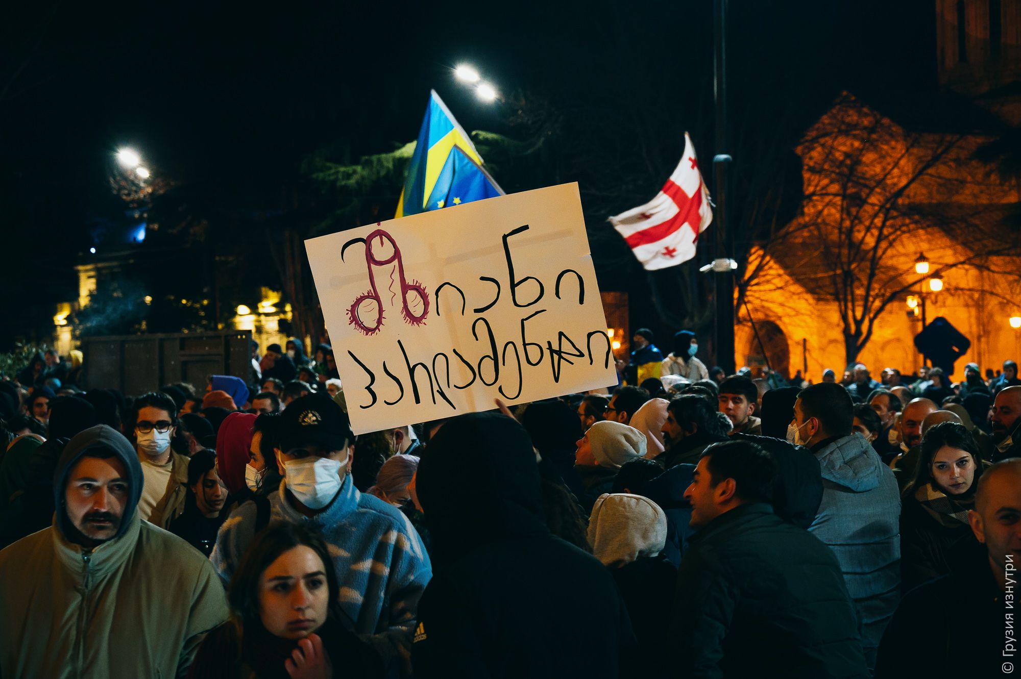 People were standing with flags — mostly Georgian and EU flags.