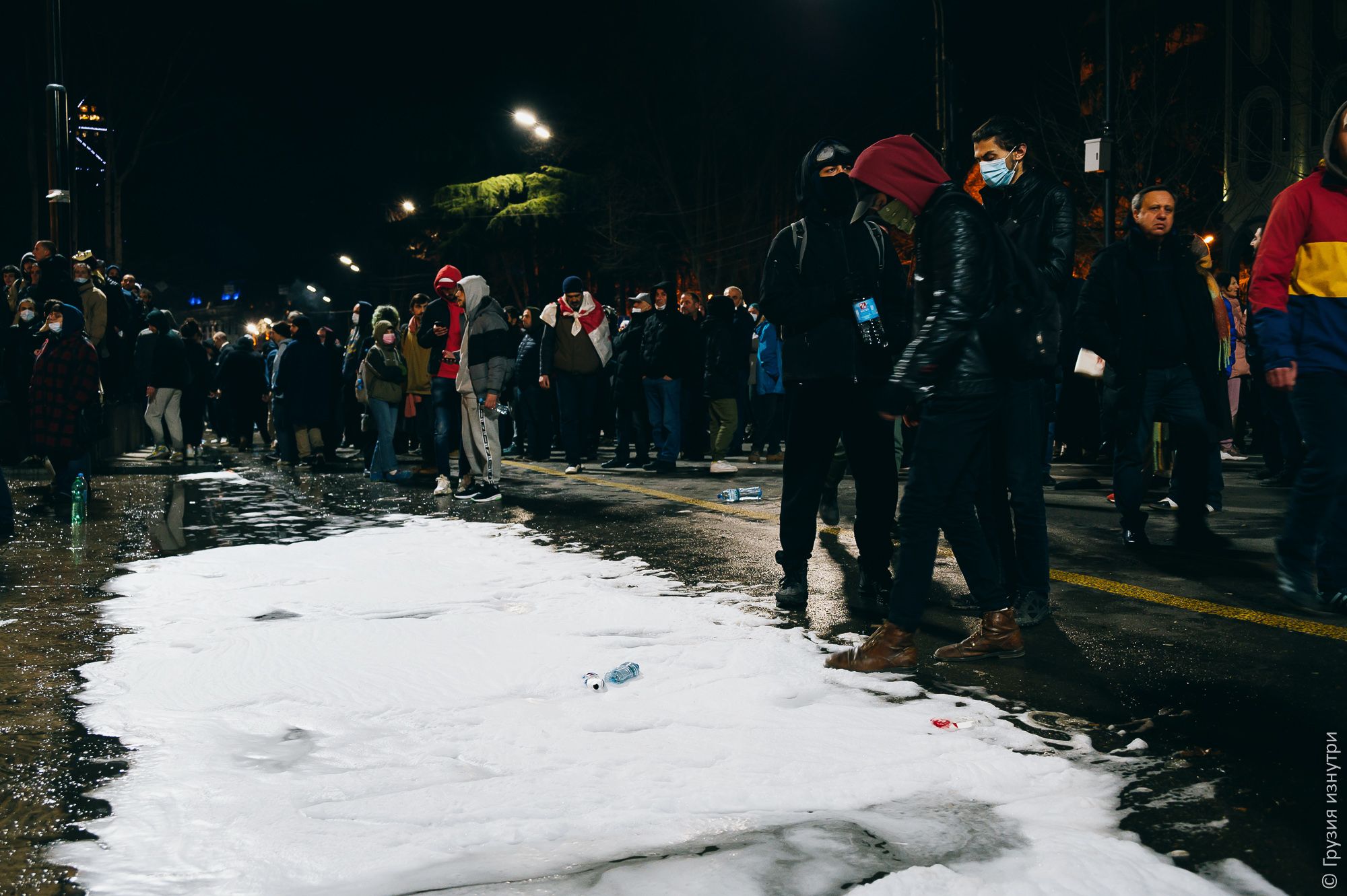 Large puddles had formed on the road from the water cannons and fire hoses the police had used earlier to push protesters back.