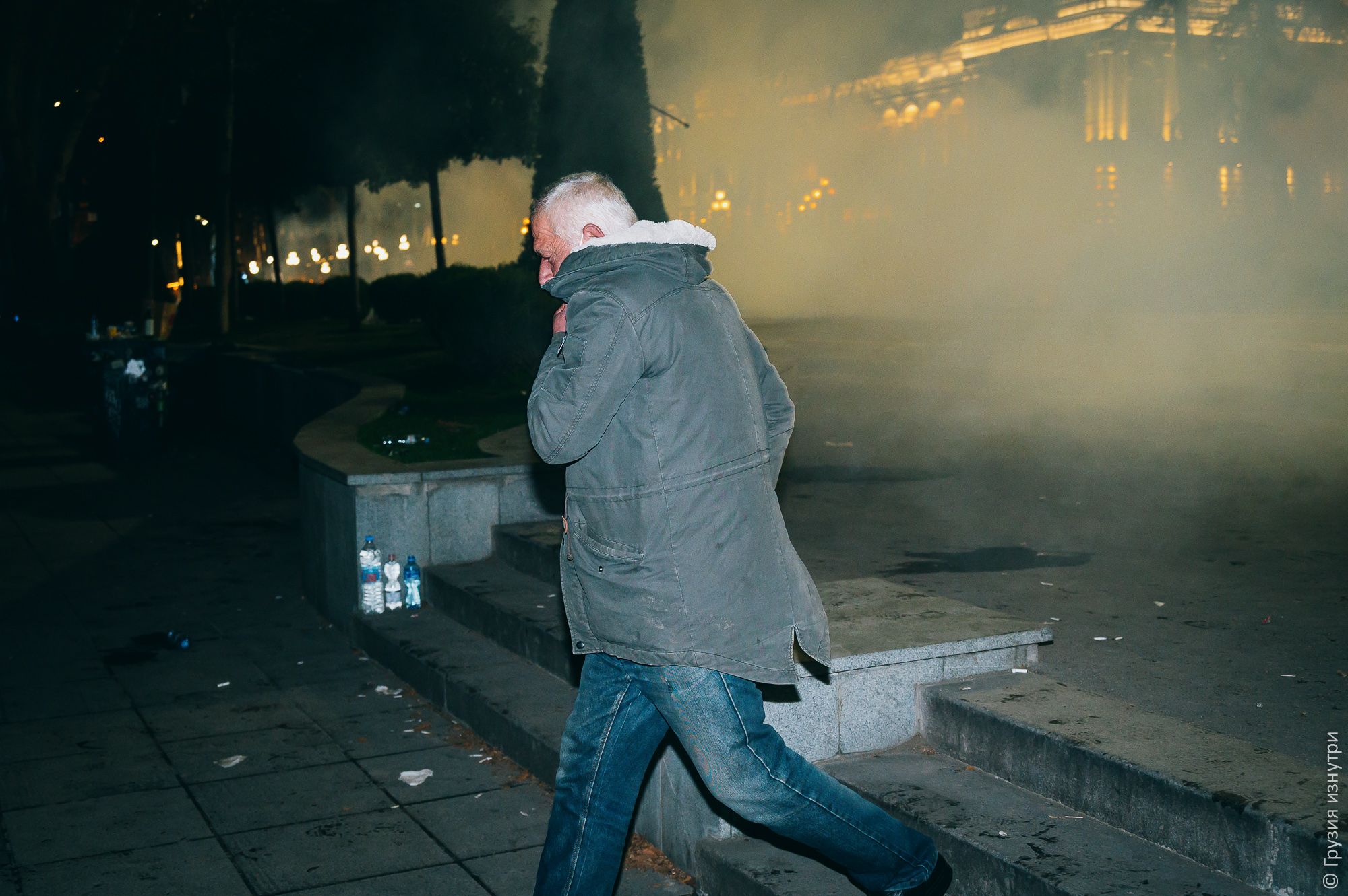 The dispersal of the protest begins. The first tear gas and stun grenades are fired into the crowd.
