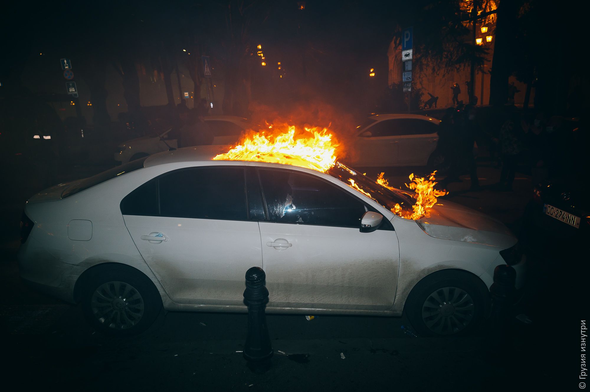 After the police used special riot-control equipment, someone set fire to a car parked nearby. Tear gas drifts through the air around it.
