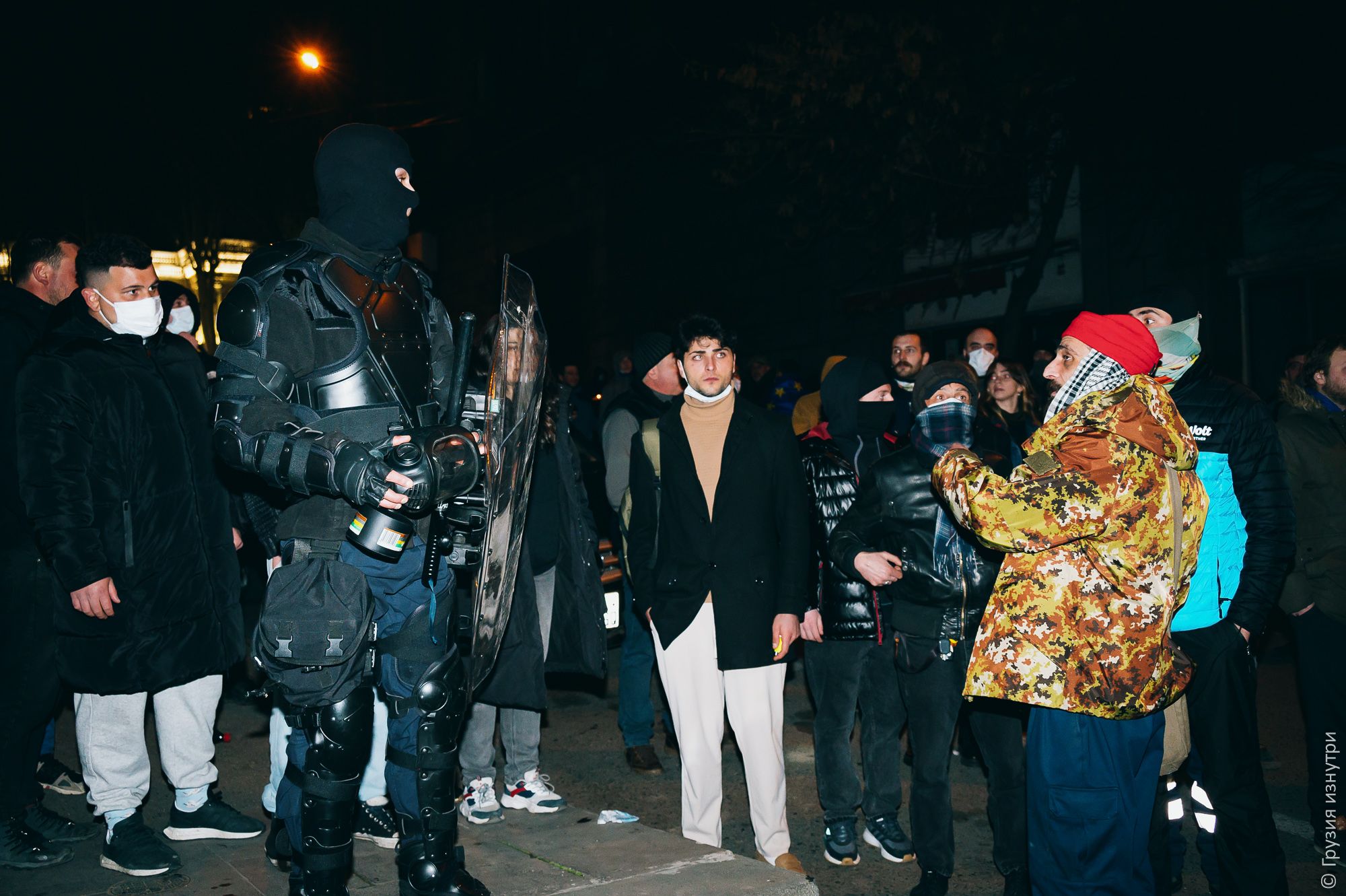 I have no idea how this happened, but one of the police officers was standing among the protesters and talking to them.